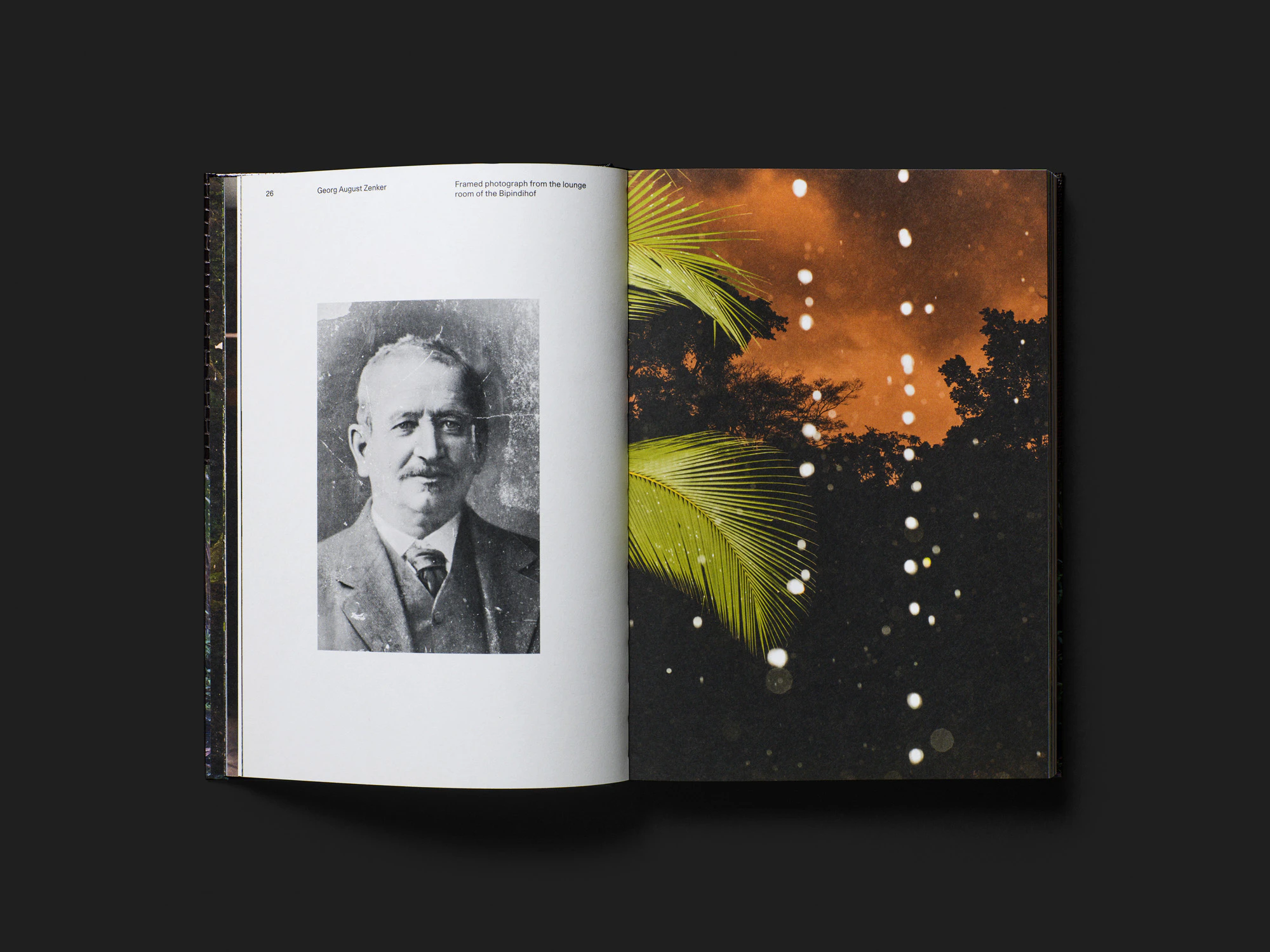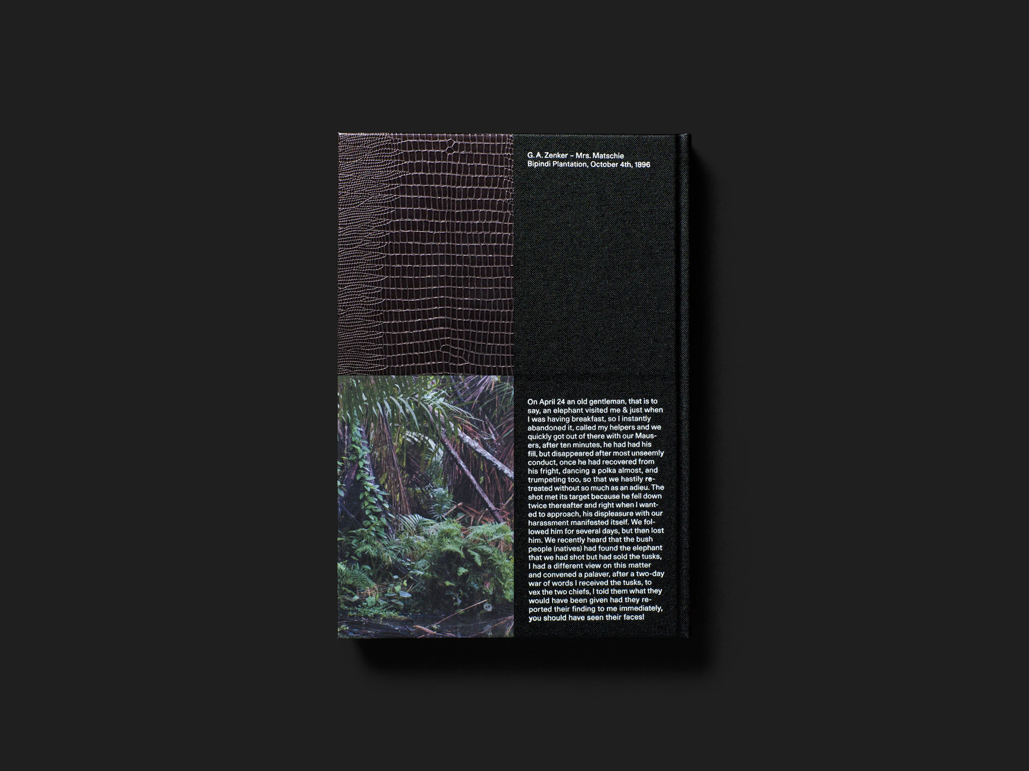 Questo volume fotografico di medio formato con mezza tela nera offre un ritratto della famiglia tedesco-camerunense Zenker in un arco di cinque generazioni. Il design affronta con abilità gli esotismi e i conflitti della storia del colonialismo tedesco. Mentre il piatto anteriore, con il motivo in pelle goffrata, il nome della famiglia e una scura fotografia della giungla, appare a un tempo cliché ed enigmatico, sulla quarta di copertina il capostipite – il botanico e colonialista Georg August Zenker – viene presentato con un estratto da una lettera del 1896 in cui si rivela essere un bracconiere e commerciante d’avorio che trattava la popolazione locale con estrema supponenza. Senza esprimere un giudizio esplicito, si pongono così le basi e il tono per l’intero volume, che combina una dozzina di lettere di Zenker (su pagine di testo in bianco e nero) con materiale fotografico storico e ritratti a colori a pagina intera dei suoi discendenti attuali, tutti dalla pelle scura. Per quanto le foto più recenti appaiano a volte documentaristiche, in un modo un tantino convenzionale, con le vecchie lettere si vengono a formare giustapposizioni cariche di tensione, che sollevano vari interrogativi sulle condizioni del post-colonialismo. All’eterogeneità del materiale risponde una griglia tanto ragionata quanto flessibile, e le lettere sono facilmente accessibili nella loro veste tipografica senza che si perdano peculiarità carismatiche come le messe in rilievo e la barratura di alcuni passaggi.